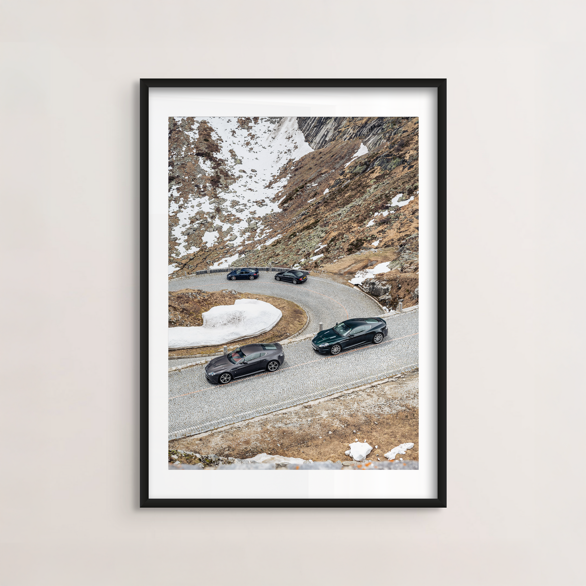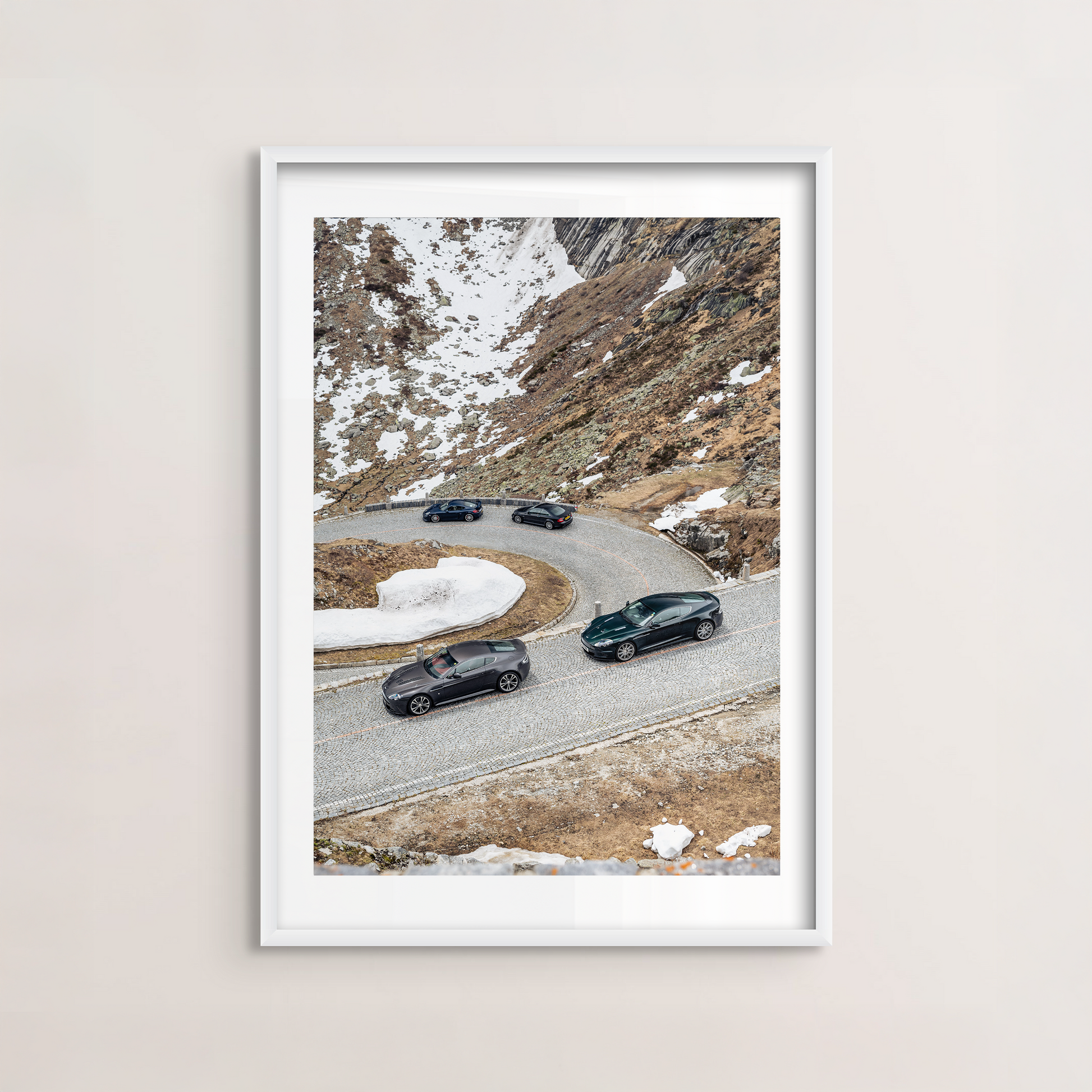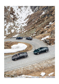 A quartet of supercars navigating the hairpin turns of a high-altitude Swiss mountain road, amid the remnants of winter snow.