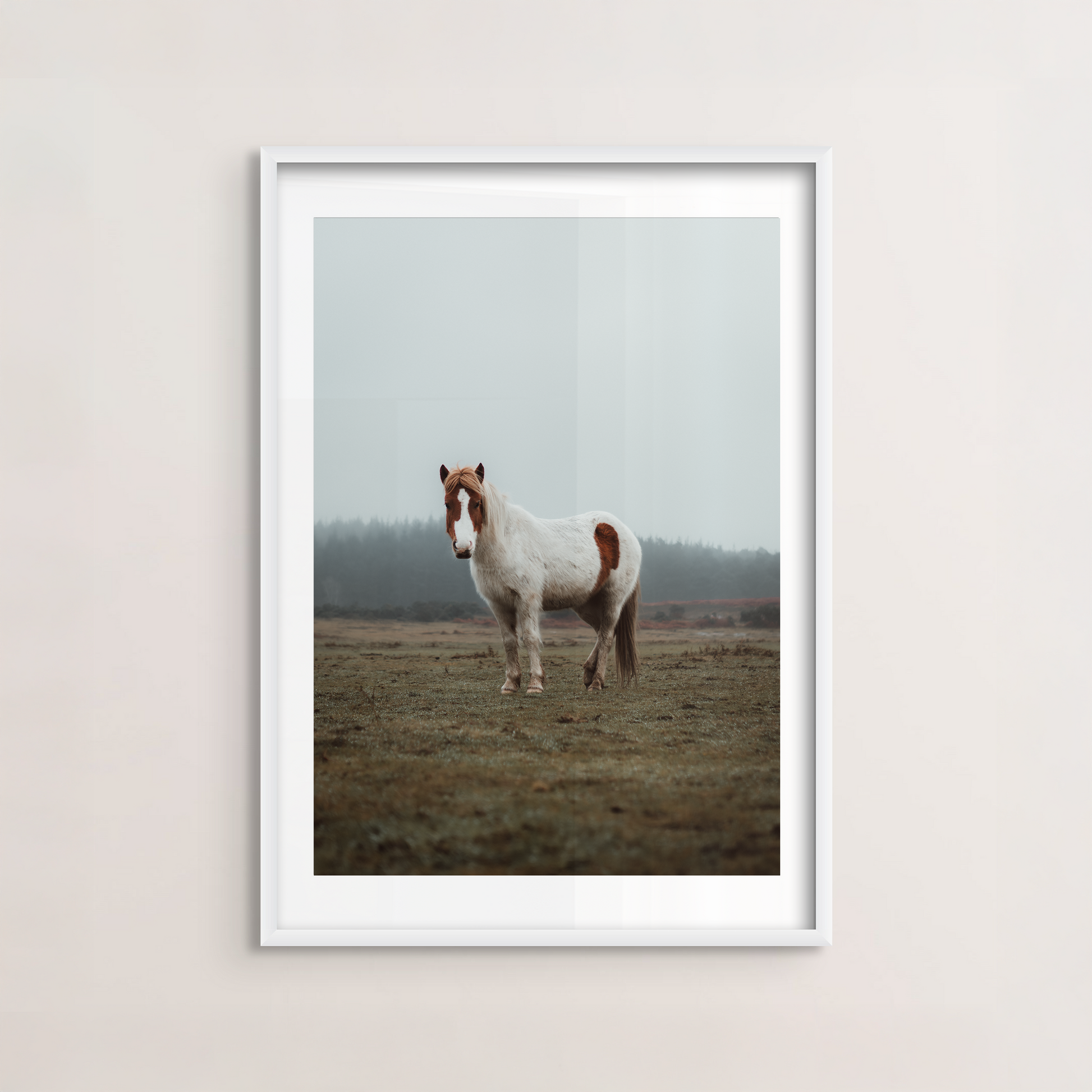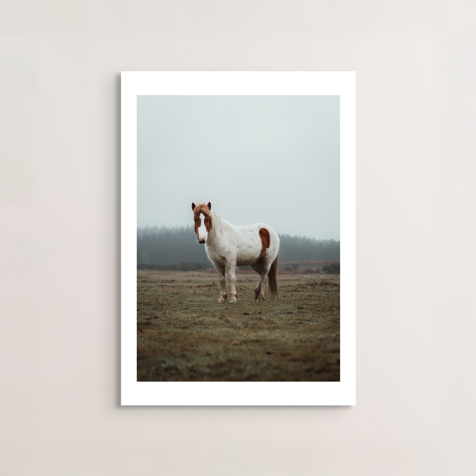 New Forest Pony captures the solitary grace of a pony standing amidst the hushed calm of the moor, under a fog-laden sky.